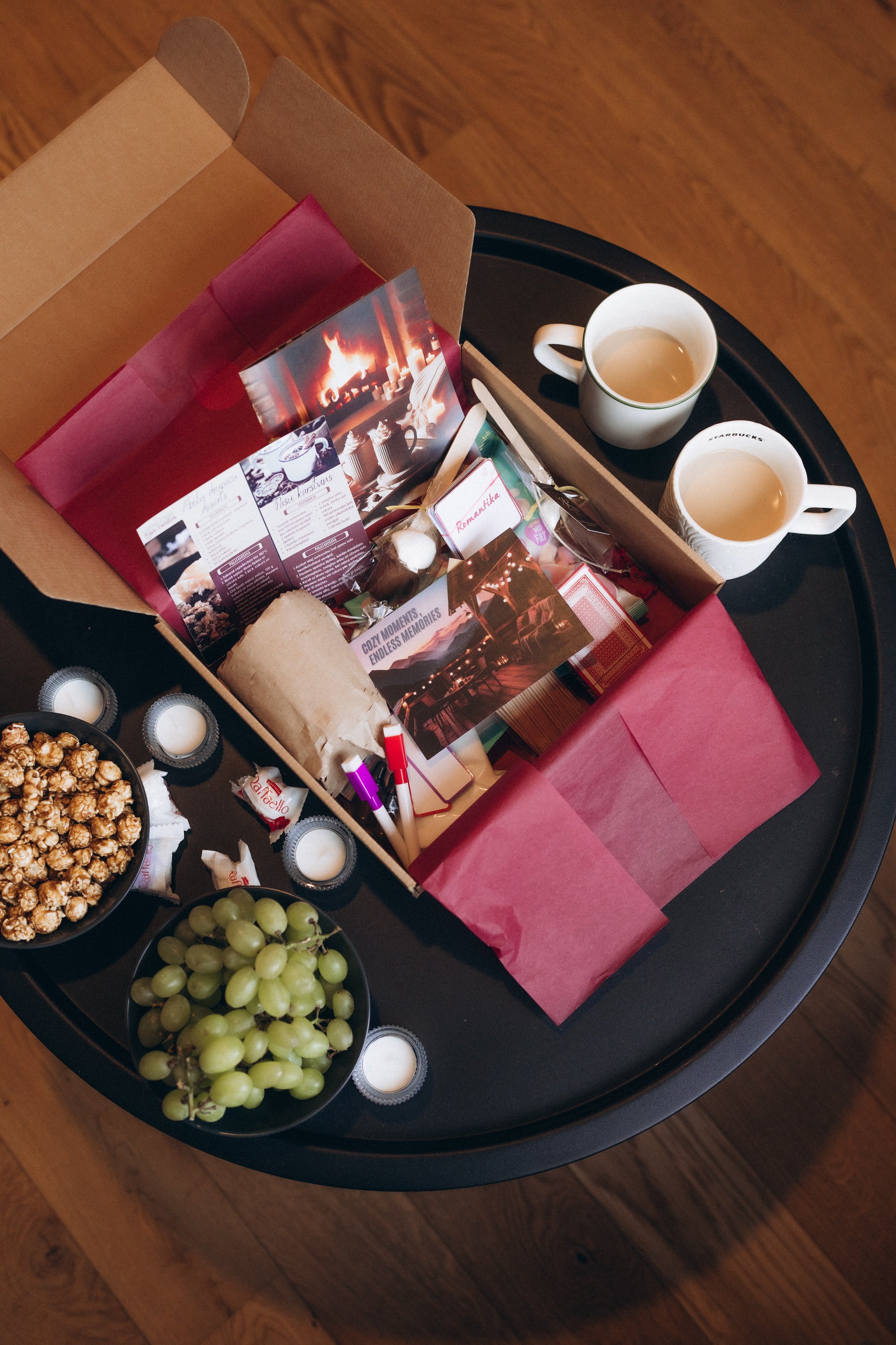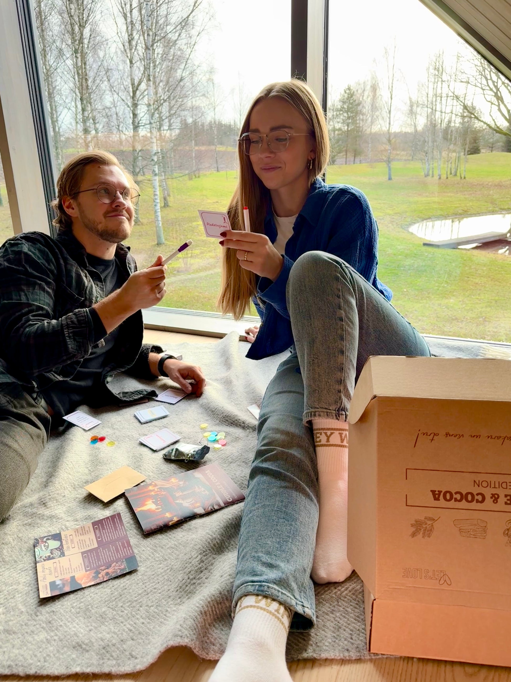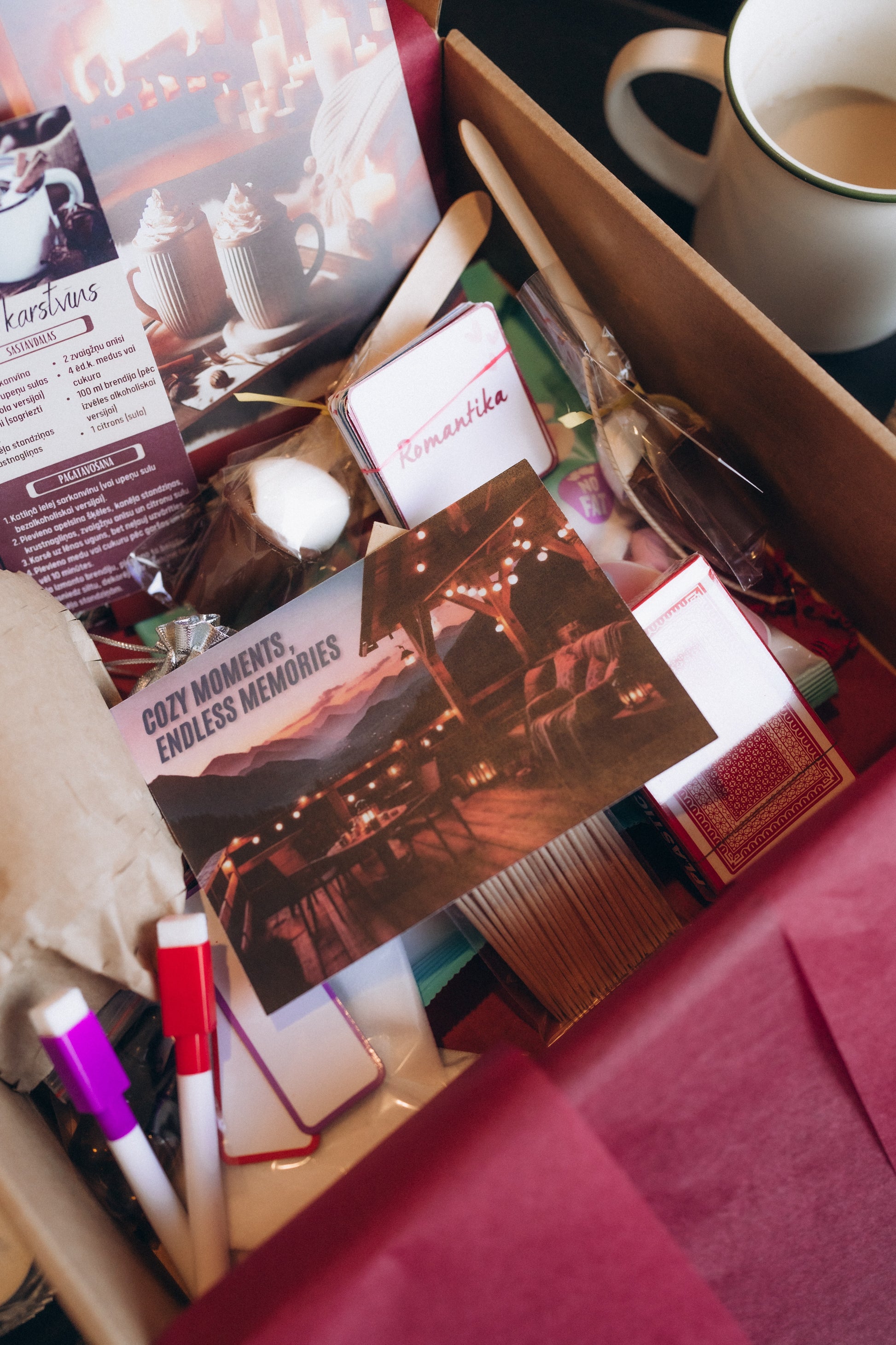 Jūs kastē atradīsiet rūpīgi sagatavotu bukletu ar ieteikumiem tematiskai noskaņas radīšanai, sarunu tēmām un jautājumiem, Spotify pleylistu, iekļauto aktivitāšu instrukcijām, filmu ieteikumiem utml. Katrā kastē ir ietverts viss nepieciešamais piedāvātajām aktivitātēm, kā arī garšīgs našķis un pāris pārsteigumi, lai vakaru padarītu vēl īpašāku.